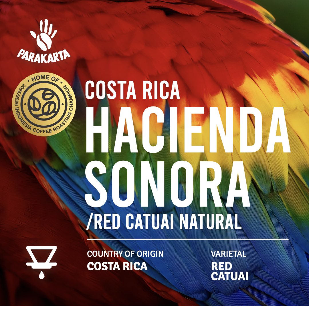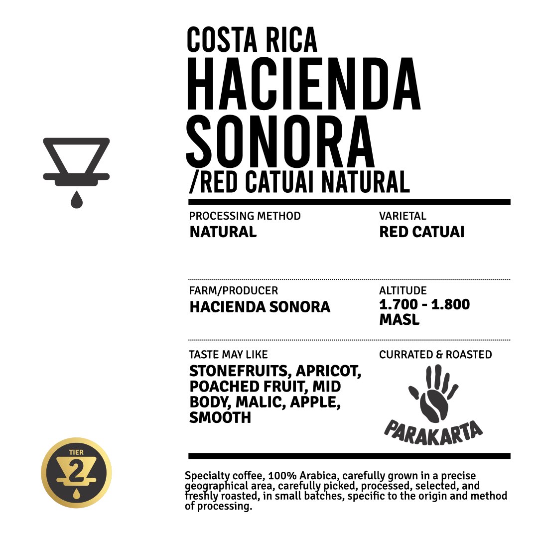 Varietas Red Catuai secara luas dianggap sebagai kopi yang cocok dengan berbagai teknik penyeduhan. Hacienda Sonora adalah perkebunan kopi yang sangat terkenal di Kosta Rika, terletak di Lembah Tengah yang menakjubkan di kaki Gunung Berapi Poal. Kopi ini ditanam di tanah vulkanik yang subur dan dikelilingi oleh beragam spesies eksotis yang secara keseluruhan membentuk ekosistem kompleks yang mendukung kualitas tinggi microlot yang dihasilkan.