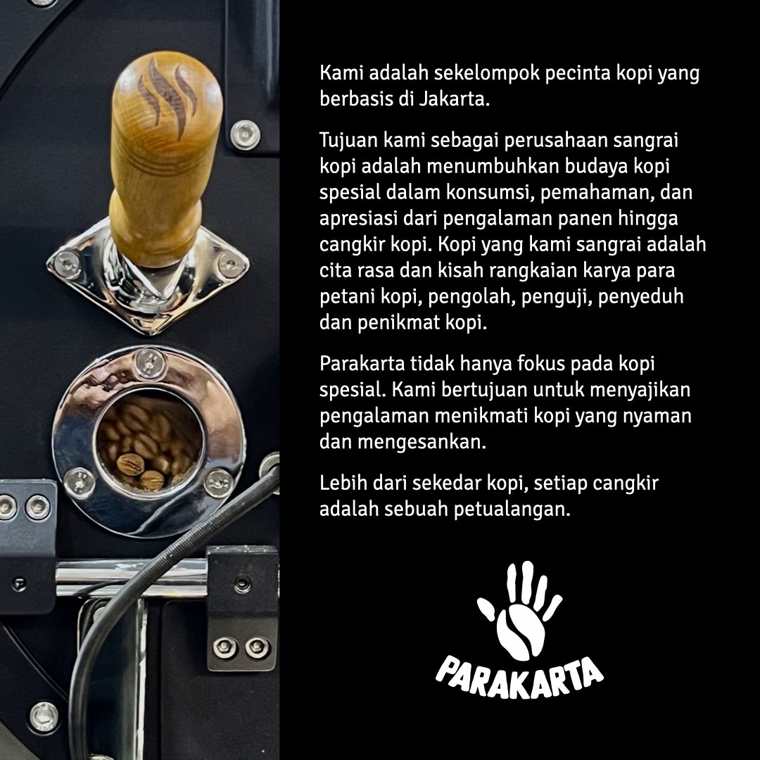 Specialty coffee, 100% Arabika, ditanam dengan hati-hati di wilayah geografis tertentu, dipetik dengan hati-hati, diproses, dipilih, dan dipanggang segar, dalam jumlah kecil, khusus untuk asal dan metode pengolahannya.